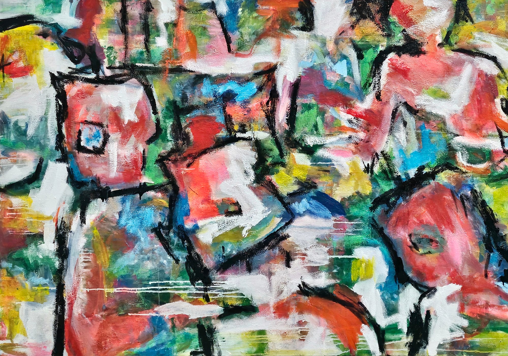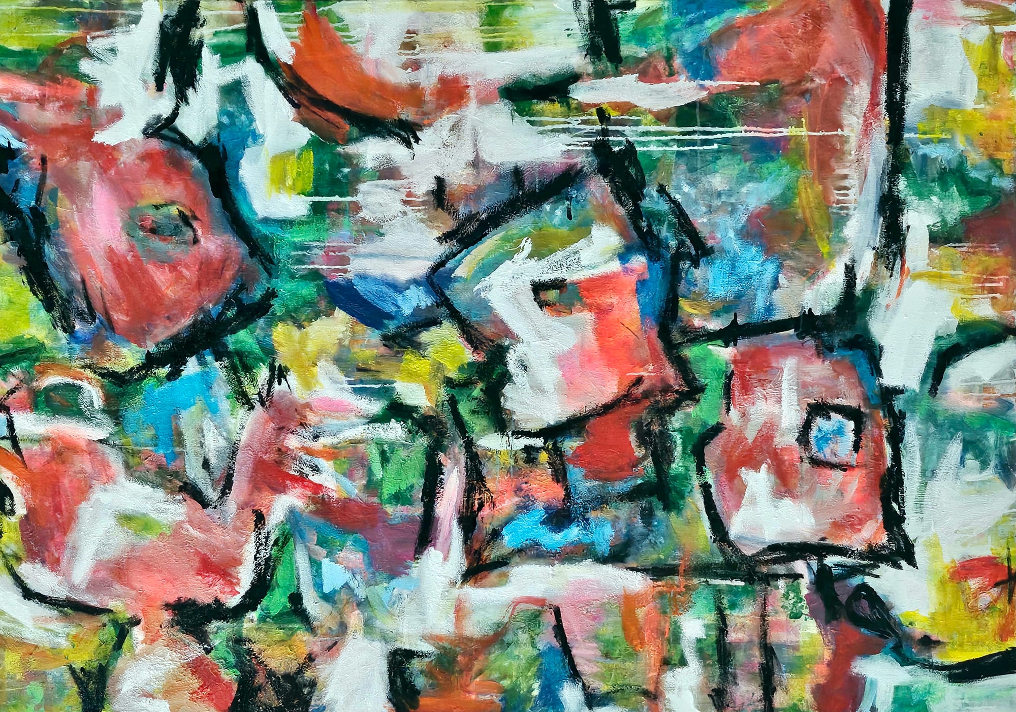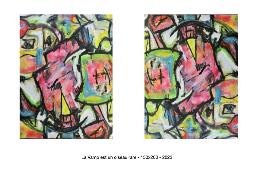 My work moves between abstraction and figuration, combining painting with experimental materials and upcycling elements. I explore perception, transformation and shifting viewpoints. Many works are open in structure—sometimes reversible or readable in multiple orientations—inviting a playful change of perspective. Found materials and historical supports become carriers of meaning. Humour, irony and a poetic clin d’œil are as important as gestural energy and colour intensity.